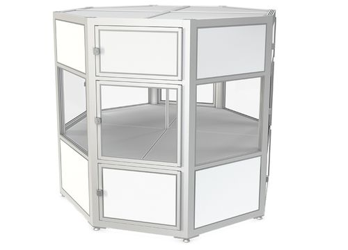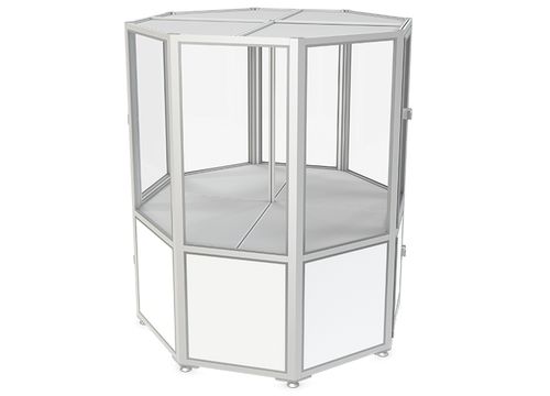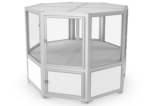 N.º Art. EX-01150La cubierta para máquinas compacta para brazos robotizados, mesas rotativas pequeñas u otras aplicaciones giratorias. Las secciones de proceso y de suministro están separadas y son accesibles a través de cuatro puertas independientes. Los conductos para cables en los perfiles esquineros proporcionan un cableado claro y seguro.